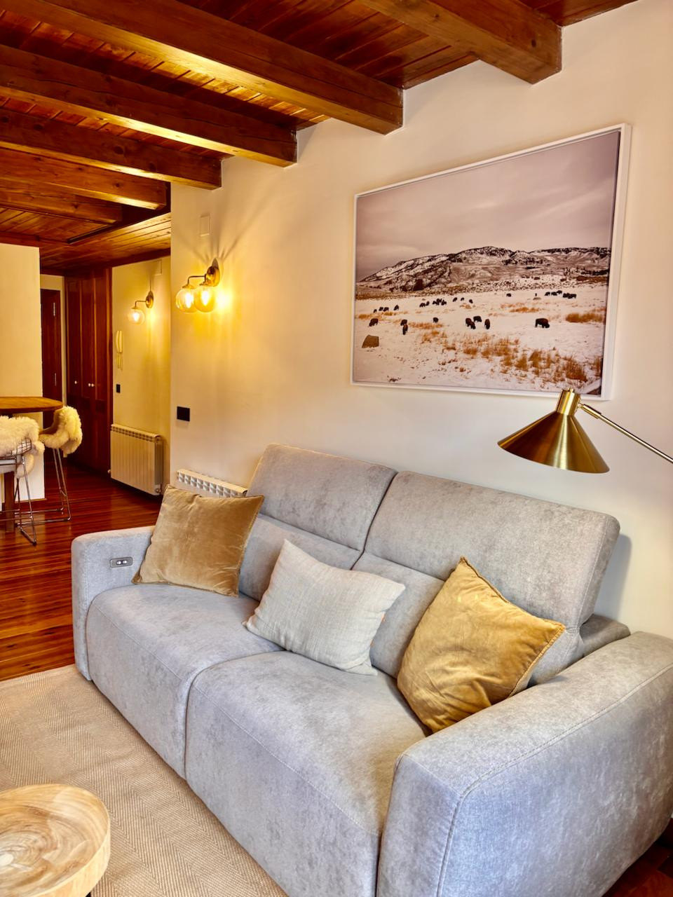 El salón-comedor es muy luminoso, con grandes ventanales que permiten disfrutar de la luz natural y de las vistas de montaña. La cocina, integrada y equipada, ofrece todo lo necesario para sentirse como en casa.