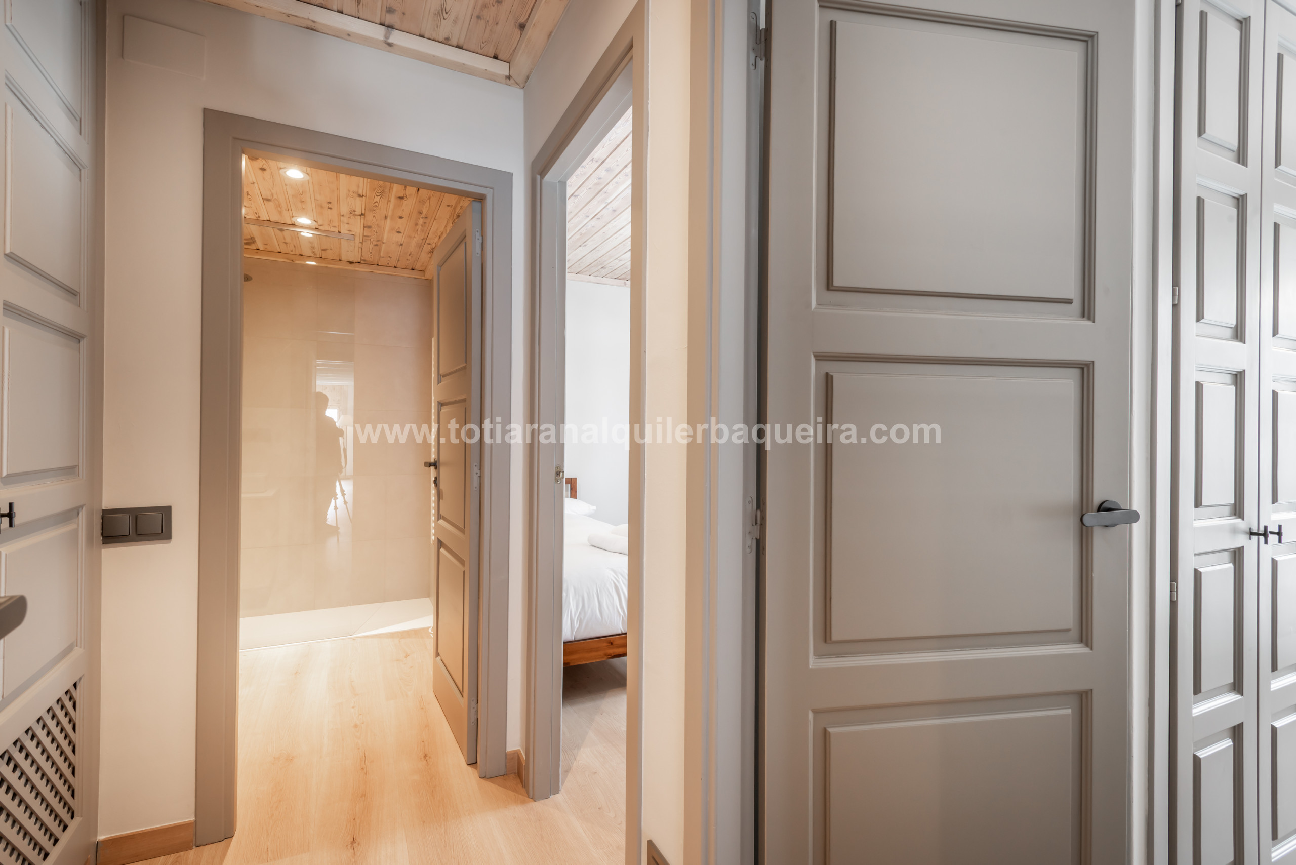 À gauche du salon se trouve la porte qui mène à une chambre avec deux lits superposés pouvant accueillir 4 personnes et à droite de la salle à manger se trouve l'autre chambre de mariage composée de 2 lits individuels. Elle dispose d'une grande fenêtre extérieure qui éclaire la chambre. À côté de chaque chambre se trouve une salle de bain complète.